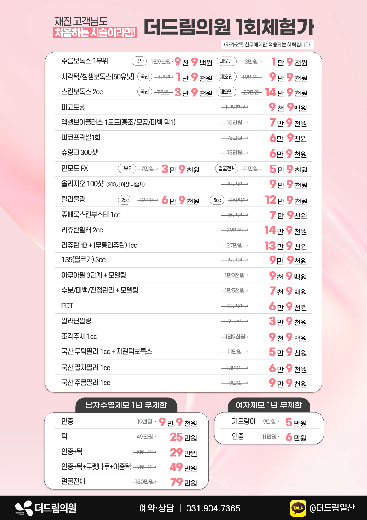 주름보톡스 국산 (1회 체험가) 19,000원 / 제오민 (1회 체험가) 30,000원